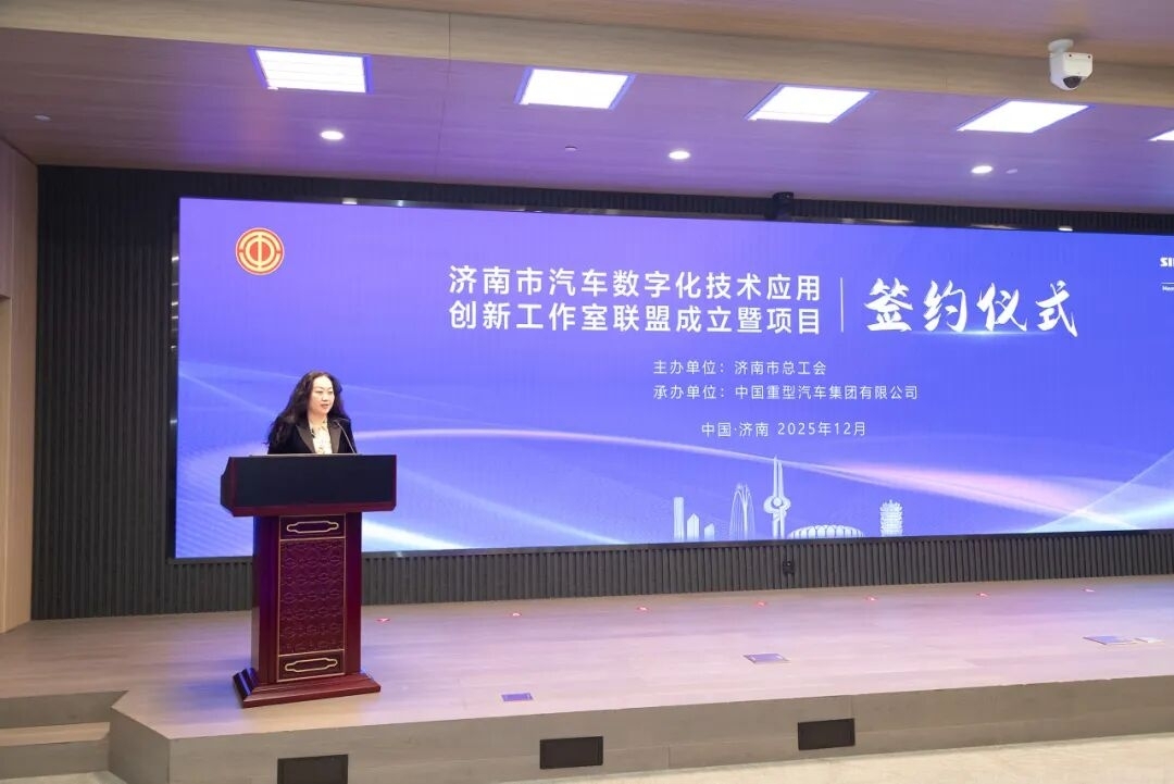 To thoroughly implement the requirements of the reform on strengthening the industrial workforce in the new era and continuously improve the quality and effectiveness of the establishment of employee innovation studios, the establishment of the Jinan Automotive Digital Technology Application Innovation Studio Alliance and the project signing ceremony were grandly held at Sinotruk on December 25. Gong Junqing, Member of the Party Leadership Group and Vice Chairman of the Jinan Municipal Federation of Trade Unions, and Jiang Pengpeng, Deputy Secretary of the Party Committee, Director, and Chairman of the Labor Union of SINOTRUK, attended the ceremony and delivered speeches.